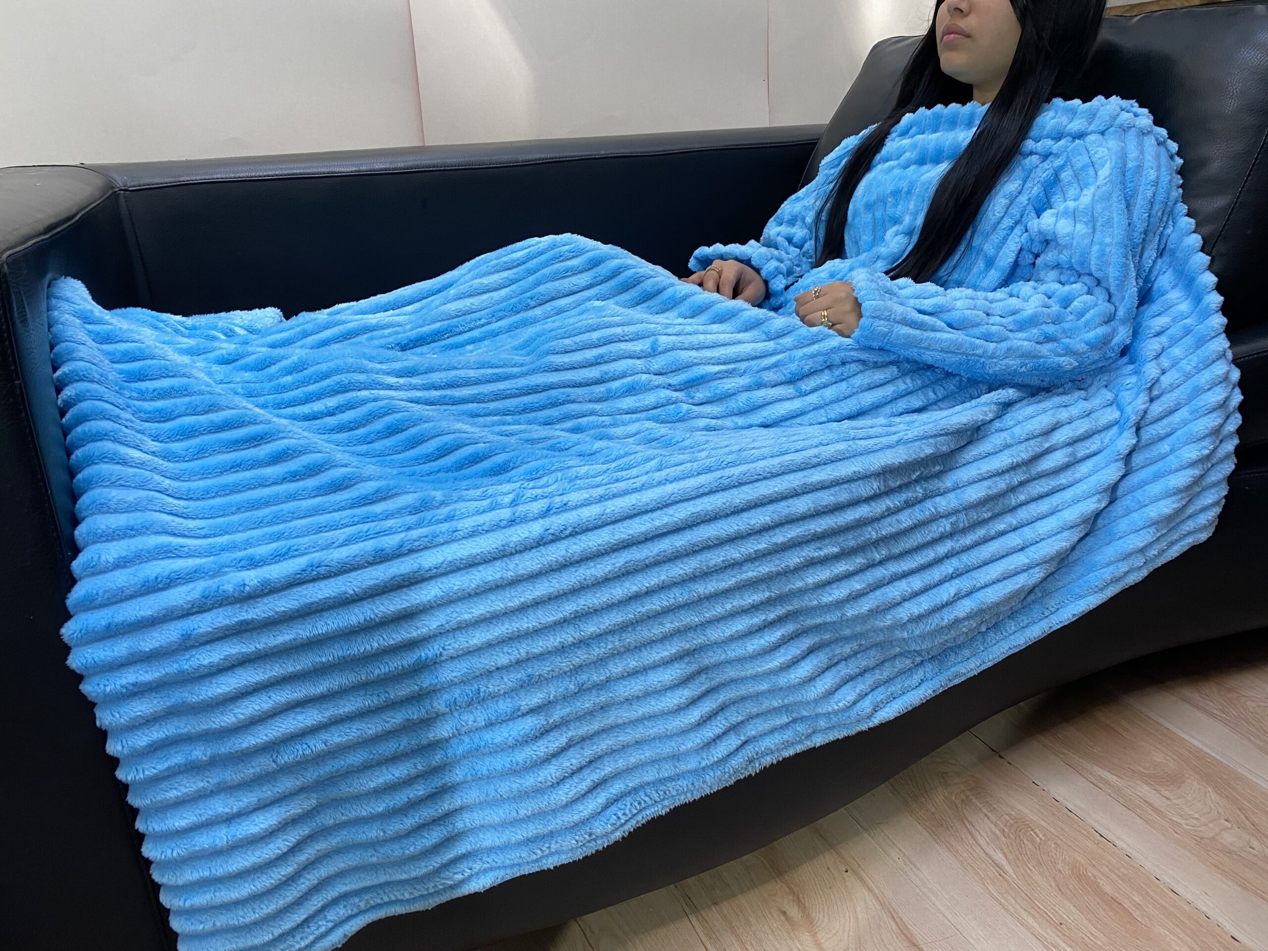 Cobija con mangas fabricada en tela «piel de conejo», que es térmica, gruesa y muy suave. Tiene una composición de poliéster 100% y es hipoalergénicas. Mide 1.50 m por 1.20m