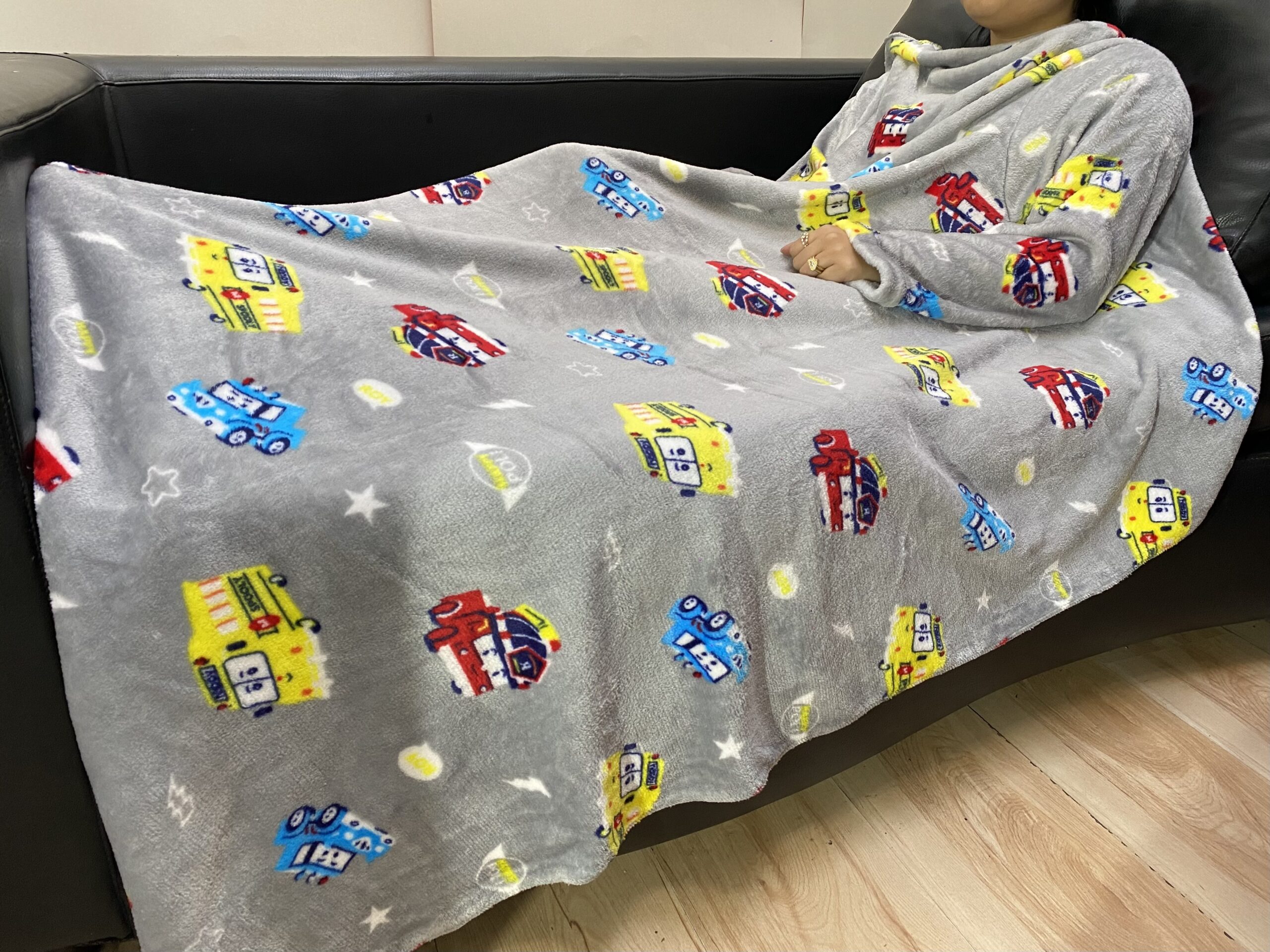 Cobija con mangas fabricada en tela «piel de conejo», que es térmica, gruesa y muy suave. Tiene una composición de poliéster 100% y es hipoalergénicas. Mide 1.50 m por 1.20m