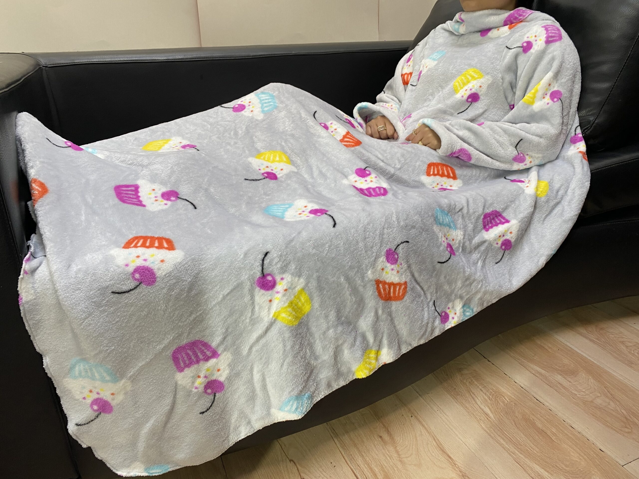 Cobija con mangas fabricada en tela «piel de conejo», que es térmica, gruesa y muy suave. Tiene una composición de poliéster 100% y es hipoalergénicas. Mide 1.50 m por 1.20m