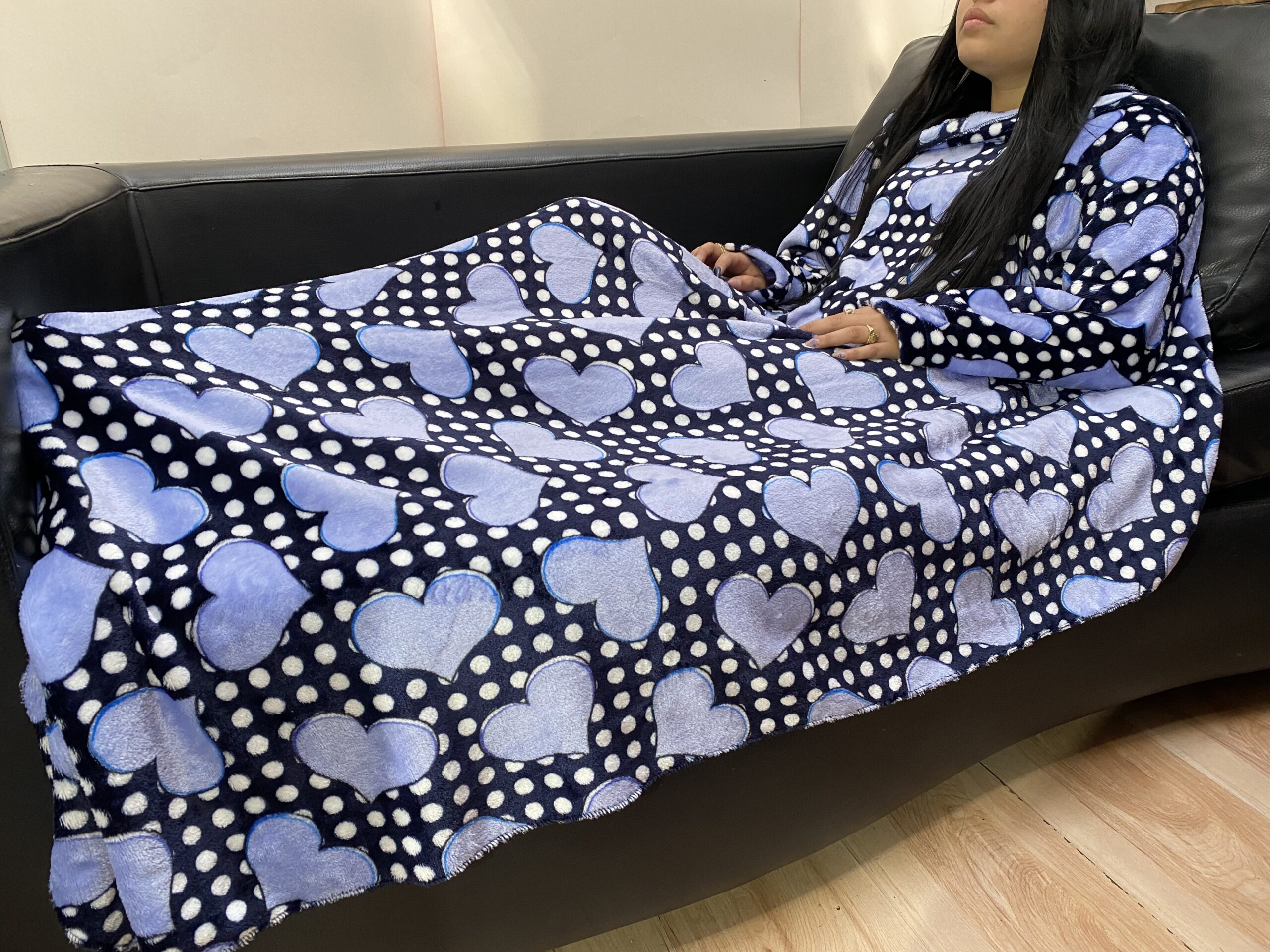 Cobija con mangas fabricada en tela «piel de conejo», que es térmica, gruesa y muy suave. Tiene una composición de poliéster 100% y es hipoalergénicas. Mide 1.50 m por 1.20m