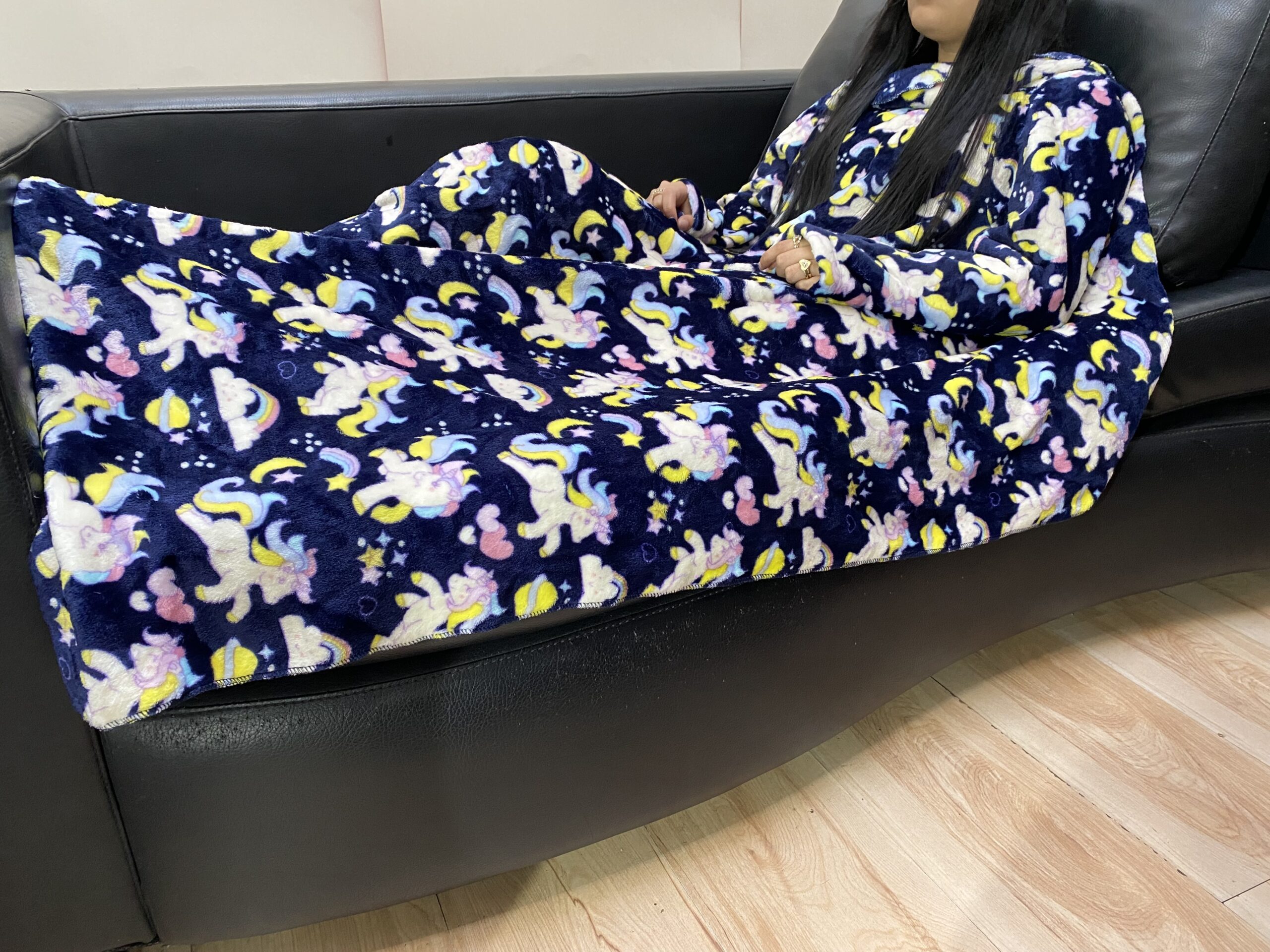 Cobija con mangas fabricada en tela «piel de conejo», que es térmica, gruesa y muy suave. Tiene una composición de poliéster 100% y es hipoalergénicas. Mide 1.50 m por 1.20m
