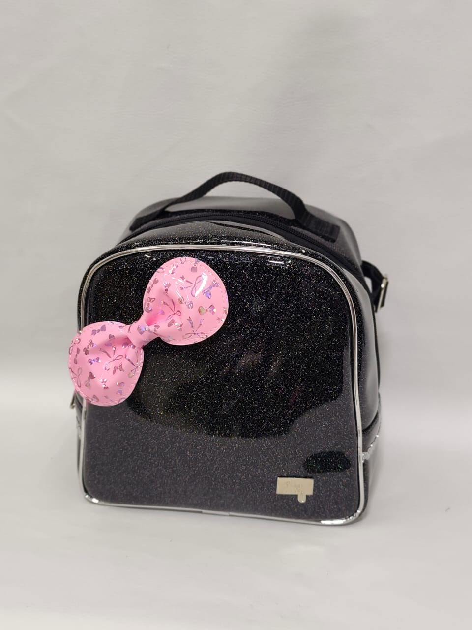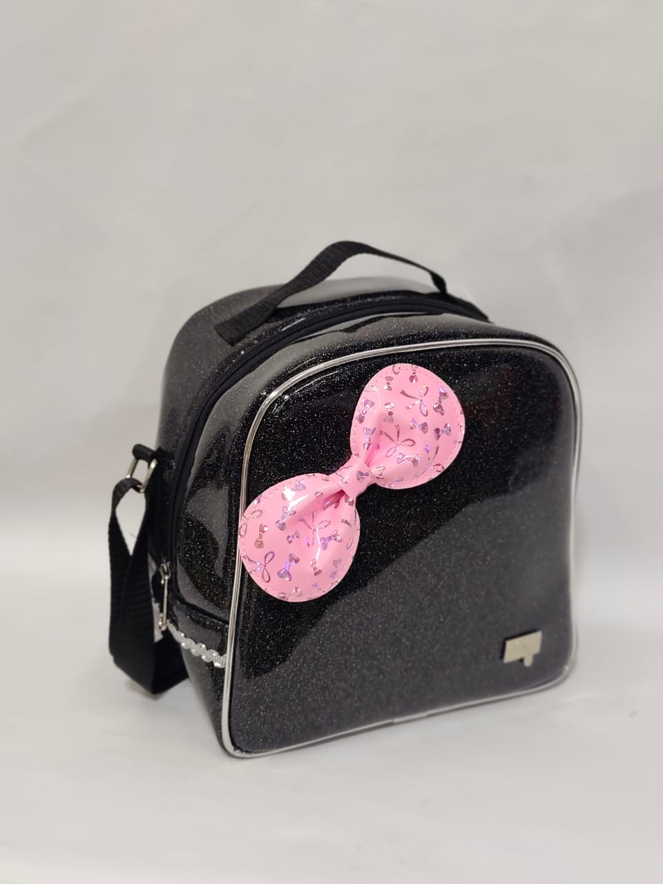 Lonchera XL Escarcha Negro Lazo Rosado